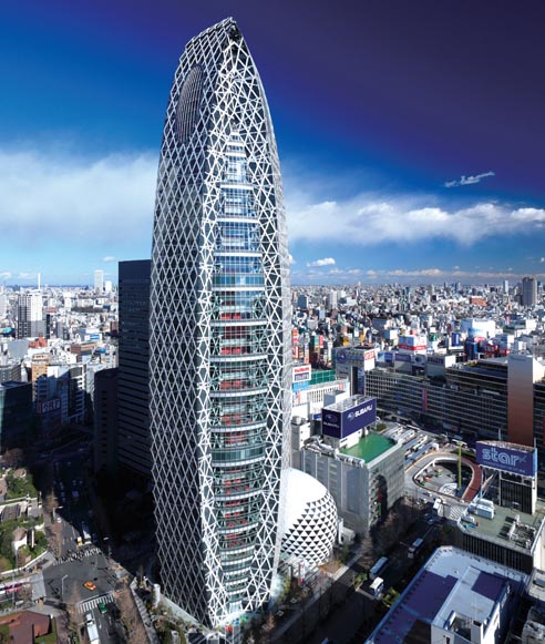 大厦分为两部分,分别由50层的塔楼和底部6层圆形商业会展大厅组成。塔楼由3面钢架结构包围处于中央位置的“内核”,主体框架是钢铁斜格结构,其表层还且一层与主体钢架结构没有关系的外挂护网。当外力作用于这种斜格结构时,大厦产生摇摆,这时从一个支点承受的冲击力会被分散到上下左右的各个支点中,整个大厦的承受的外力就分散开了,晃动也随之被吸引。这种结构不但可以提高抗震的强度,对于风力所引起的晃动也能有效吸收。